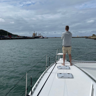 Nach einem schönen Abschiedsabend mit Liz, Mark und Reini auf der Najuma sind wir morgens um 9 Uhr startklar. Renier der uns bis auf die Seychellen begleitet und das Revier wie seine Hosentasche kennt ist auch pünktlich an Bord. Der Abschied fällt schwer und so ist es am Besten die Maschinen zu starten und raus zu fahren ins neue Abenteuer. Alle unsere Freunde stehen am Quai und Peter eskortiert uns zusammen mit Liz, Mark und Charlene bis zu den Heads, dann sind wir allein, setzen die Genua und segeln hinaus aufs blaue Wasser, Kurs East London. Bilderbuchbedingungen, wenig Schwell in der Nacht ein Blue Moon Ereignis und die Weite des indischen Ozeans. Wir haben nur ein kurzes Wetterfenster um die ersten 288 nm hinter uns zu bringen, aber wir laufen mit der Strömung und dem Wind im Rücken unter der Küste mit bis 9,5 kts über Grund; wir fliegen! Bei der Einfahrt in den Hafen von East London holen uns die ersten Südwest Winde mit bis zu 30 Knoten ein. Quer zum Wind spürt man dann die Kraft und die Wellen werden schnell höher. Unser Ziel ist der Buffalo River Yachtclub in der hintersten und geschützten Ecke des Industriehafens. Um 21:10 legen wir am Steg an. Gottfried ist sehr nervös und noch nicht so sicher im Umgang mit dem Katamaran, aber mit Hilfe von Sandra und Renier und zwei Helfern am Steg geht alles wunderbar; nur keine Hektik immer langsam. Ein Bier an der Bar im Clubhaus und danach geht's in die Koje.